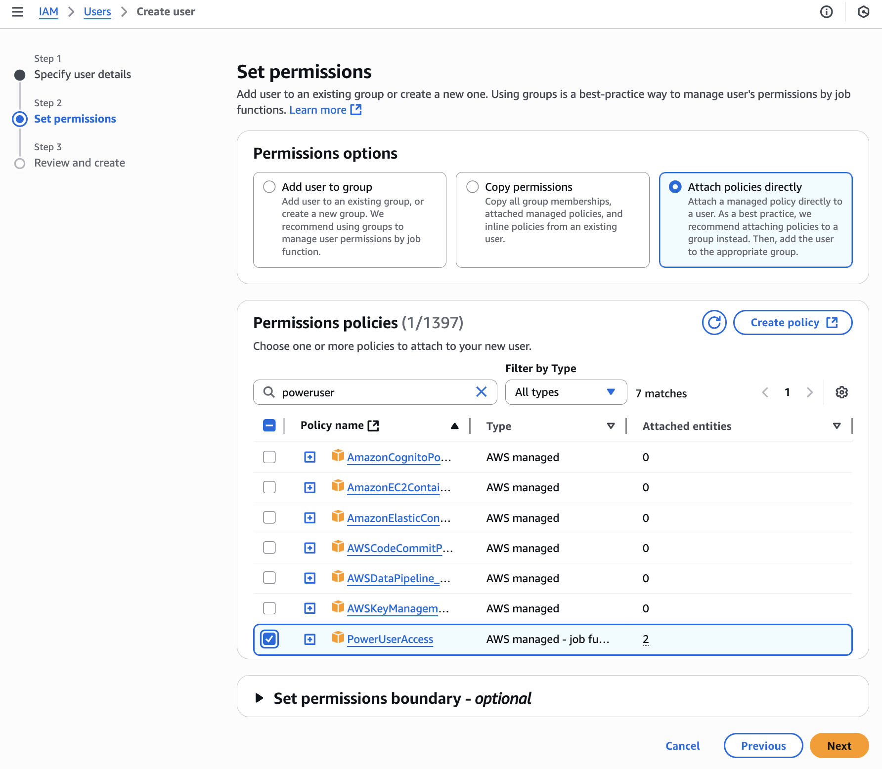 Enter a user name, and assign permissions. Defang requires the PowerUserAccess